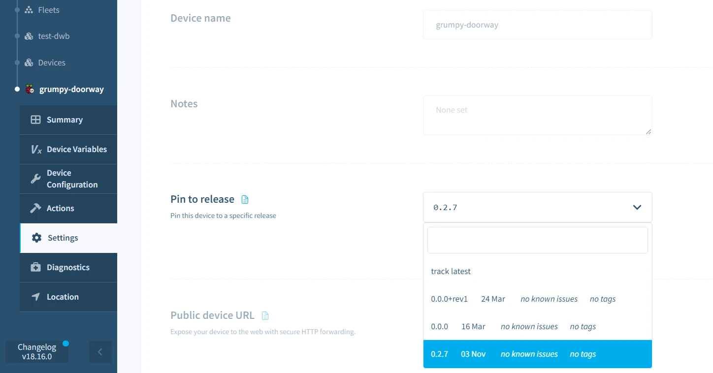 By default, the setting is set to track latest, which means that new releases are immediately deployed to all devices in the fleet when built. When the fleet is pinned, all devices that are not currently pinned to a release are updated to run the pinned release, and in the future, releases will not be deployed until the pinned release is updated to a different release or set to track latest.